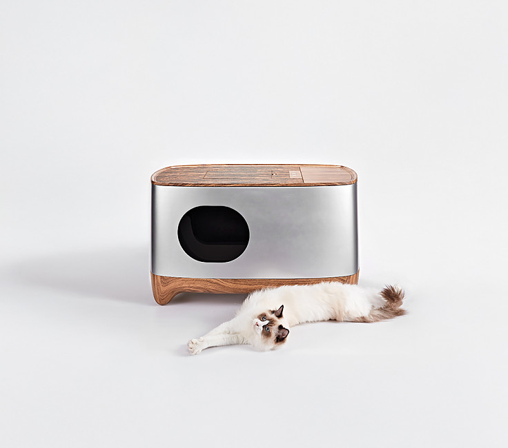 Inspired by the concept of “a litter box you’d want to display,” it combines warm wood textures with cool metal finishes for a refined and modern look.